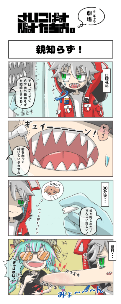 親知らず! Posted on: 2025年8月20日 Posted by: revico.co Comments: 0 タグ: 4コマ劇場, 4コマ劇場, 4コマ漫画, さいこぱすぴすたちお。, ミニキャラ劇場, 二次創作, 漫画 昨日、口腔外科で左下の親知らずを抜きました。右下はもともと生えていなくて、左下は埋まったまま。「早めに抜いた方がいいですよ」と言われ続けて、ようやく決心。 正直、一番痛かったのは麻酔で、それ以降はあっという間に終わってスッキリ! そんな抜歯体験を、4コマ漫画にしました。 P.S. 思った以上に顔がパンパンでわらけました 4コマ劇場