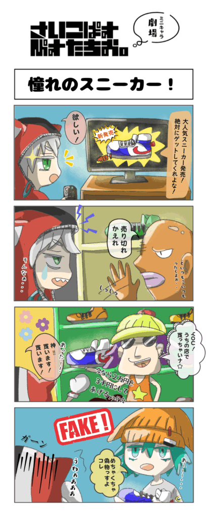 憧れのスニーカー! Posted on: 2025年8月23日 Posted by: revico.co Comments: 0 タグ: 4コマ劇場, イラスト, さいこぱすぴすたちお, ミニキャラ劇場, 漫画 こんばんは! 今日は、新キャラがちょっとだけ登場します! サイピスの新しいイラストに登場する、 ニット帽のおしゃれが好きな少年! まだ名前は決まっていなくて、考え中です…。 (いい名前が浮かんだら、ぜひ教えてください) これから少しずつ出番が増えていくので、お楽しみに! ちなみに、 レドは赤(RED)からレドになりました!☺ P.S.次回はあのピンク頭の女の子が登場するよ☆ 4コマ劇場
